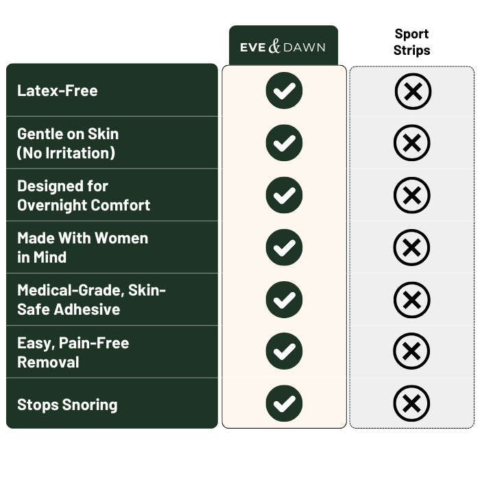 Solution: Eve & Dawn Nose Strips are made with women in mind. Our medical‑grade, skin‑safe adhesive is gentle, comfortable for all‑night use, and removes easily without leaving marks.